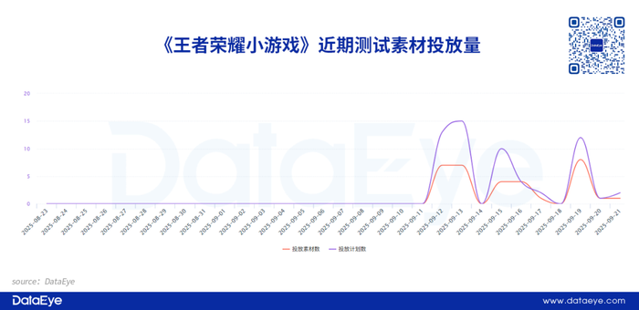 从营销层面来看,《王者荣耀小游戏》测试期间也进行了素材投放测试。DataEye-ADX投放数据显示,《王者荣耀小游戏》在9月12日才开始进行测试素材投放,并在9月21日结束测试。整体测试素材力度较小,单日投放素材峰值不超过10组,但全部为视频类型素材。